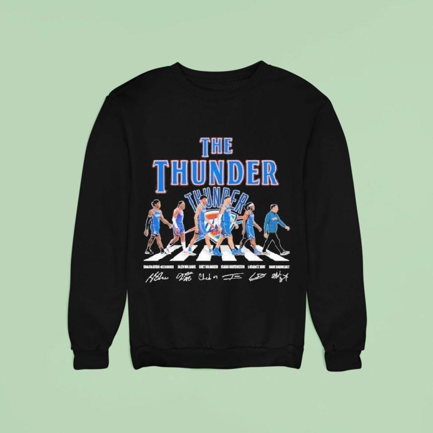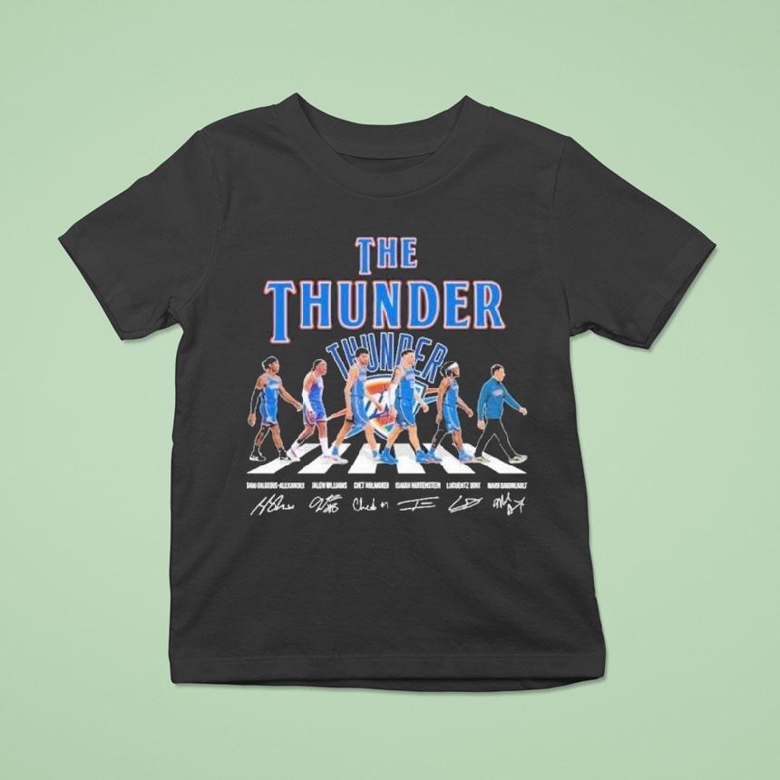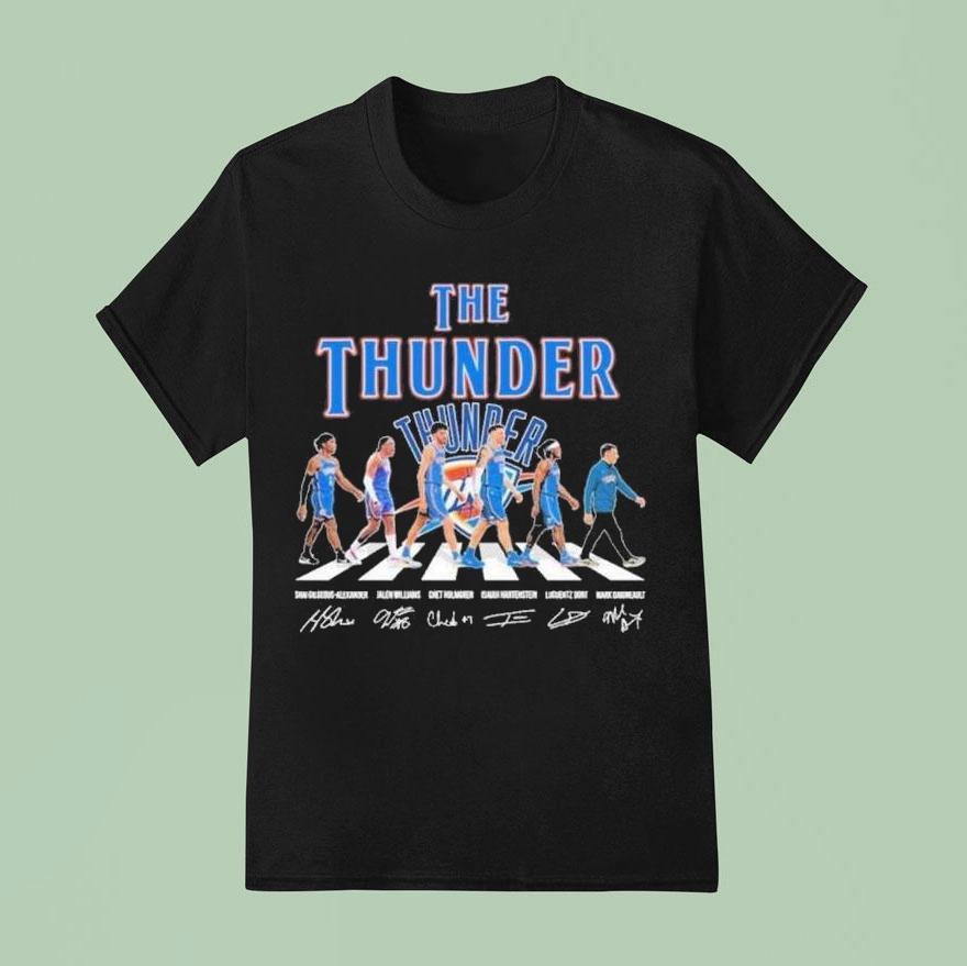 Simple sophistication with The Okc Thunder Abbey Road Conference Finals 2025 Signatures Shirt, in 2025, the OKC Thunder made a historic run to the NBA conference finals. But it wasn’t just their performance on the court that caught everyone’s attention. The team’s iconic “Abbey Road” inspired jersey, featuring player signatures, became a must-have for fans and a symbol of their unforgettable journey.