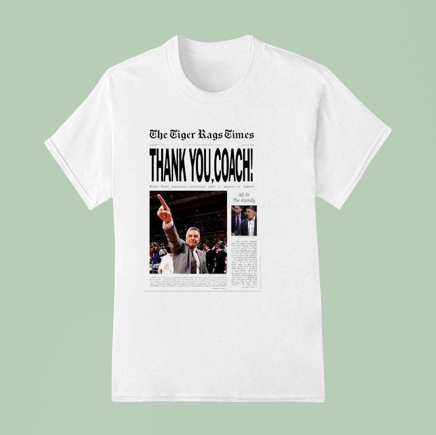 Chic comfort, everyday fashion with The Tiger Rags Times Thank You Coach Bruce Pearl Announces Retirement After 11 Season At Auburn Shirt, the Tiger Rags Times is filled with mixed emotions as we say thank you to Coach Bruce Pearl for his 11 incredible seasons at Auburn. His passion, dedication, and success will be greatly missed, but his legacy will live on through the coveted Auburn Shirt.
