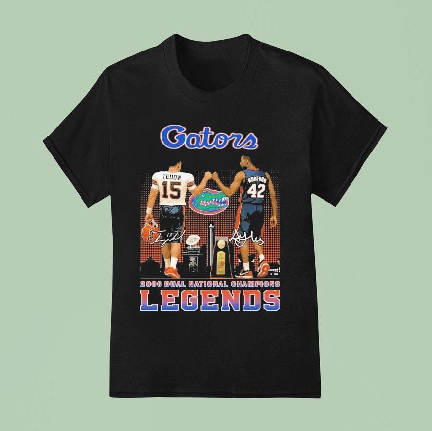 Wardrobe essential, always chic with Tim Tebow X Al Horford Florida Gators 2006 Dual National Champions Legends Signatures Shirt, the 2006 Florida Gators were a powerhouse team, led by two legends who took the college sports world by storm. Tim Tebow and Al Horford left their mark on the field, and now their legacy lives on with the iconic Dual National Champions Legends Signatures shirt.