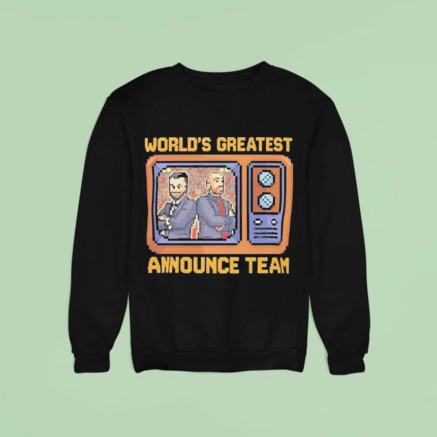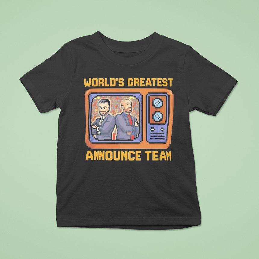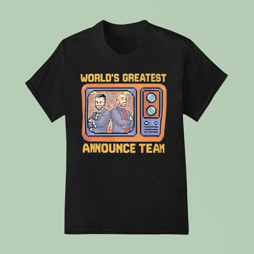 Effortlessly cool with Tom Matt World’s Greatest Announce Team Tv Shirt, introducing the limited edition Tom Matt World’s Greatest Announce Team Tv Shirt! This exclusive apparel features a bold design celebrating the legendary duo known for their witty commentary and unparalleled chemistry. Show your support for the best announce team in the world with this must-have shirt.