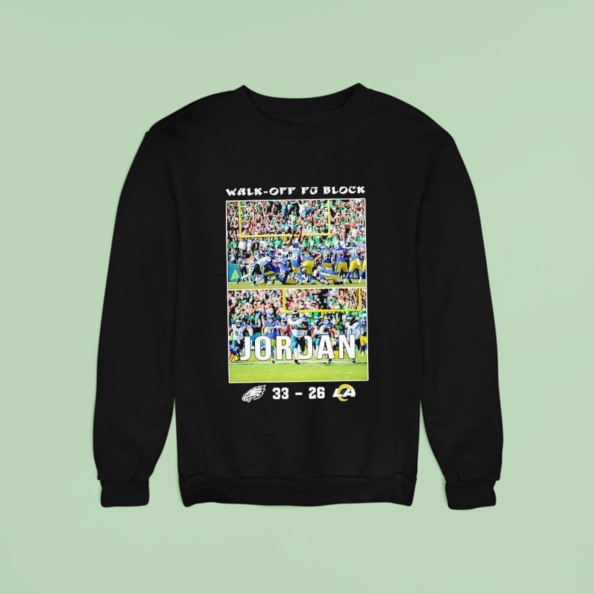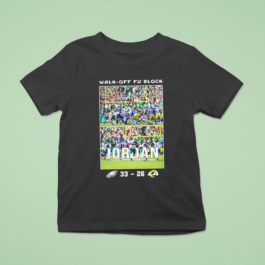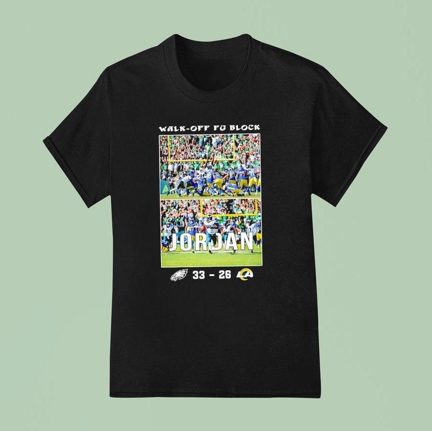 Unmatched comfort, chic look with Walk-off Fg Block Jordan Philadelphia Eagles Vs Los Angeles Rams 33-26 Football Shirt, in a thrilling game that had fans on the edge of their seats, the Philadelphia Eagles pulled off a nail-biting victory against the Los Angeles Rams with a walk-off field goal block by Jordan. The crowd erupted as the Eagles secured a 33-26 win, making a statement in their football shirts.