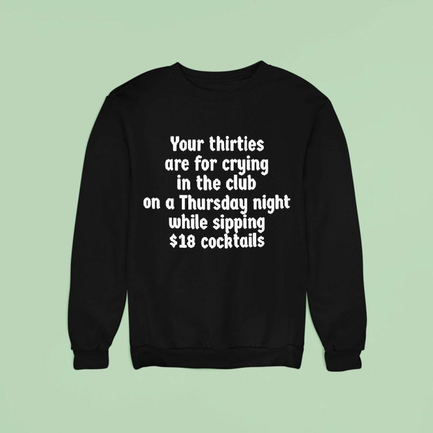 Classic charm, modern edge with Your Thirties Are For Crying In The Club On A Thursday Night While Sipping Shirt, less As we enter our thirties, the club scene may seem like a distant memory. But don’t be fooled, these are the years when we truly embrace our emotions on a Thursday night, shedding tears and sipping drinks shirtless, as we navigate the highs and lows of this transformative decade.